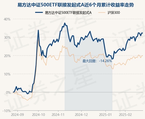 证券之星消息,2月27日,易方达中证500ETF联接发起式A最新单位净值为1.4095元,累计净值为1.4095元,较前一交易日上涨0.0%。历史数据显示该基金近1个月上涨7.35%,近3个月上涨3.78%,近6个月上涨31.78%,近1年上涨14.63%。该基金近6个月的累计收益率走势如下图: