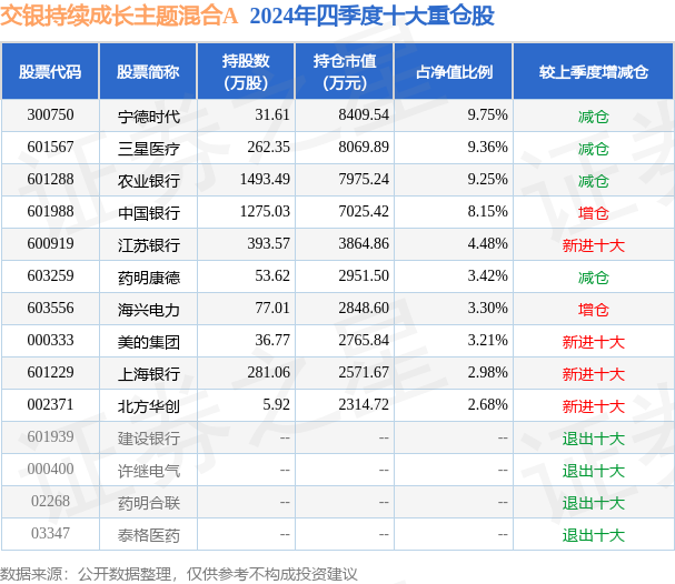 交银持续成长主题混合A为混合型-偏股基金,根据最新一期基金季报显示,该基金资产配置:股票占净值比83.82%,债券占净值比5.87%,现金占净值比17.6%。基金十大重仓股如下: