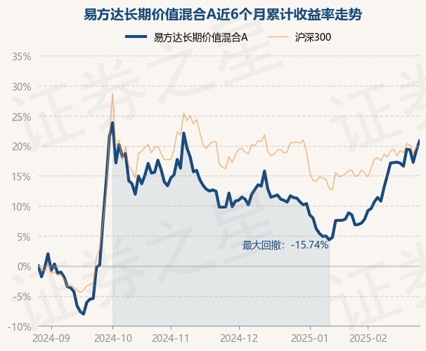 证券之星消息,2月27日,易方达长期价值混合A最新单位净值为0.9386元,累计净值为0.9386元,较前一交易日上涨1.26%。历史数据显示该基金近1个月上涨12.09%,近3个月上涨7.76%,近6个月上涨20.81%,近1年上涨12.46%。该基金近6个月的累计收益率走势如下图: