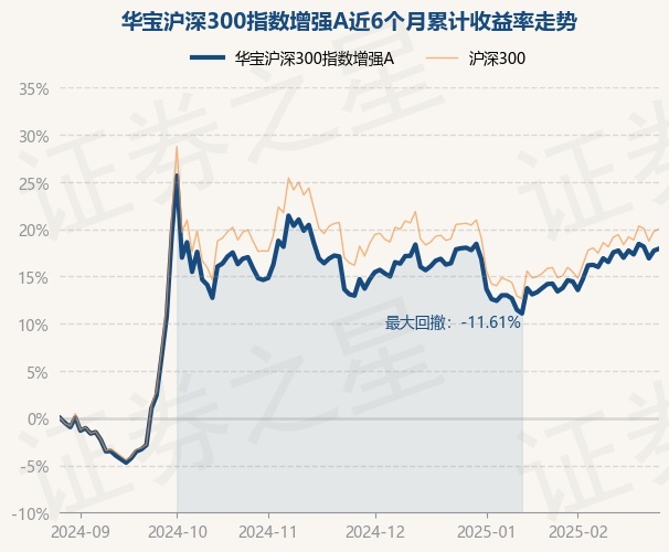 证券之星消息,2月27日,华宝沪深300指数增强A最新单位净值为1.4434元,累计净值为1.6824元,较前一交易日上涨0.17%。历史数据显示该基金近1个月上涨3.03%,近3个月上涨2.81%,近6个月上涨17.93%,近1年上涨14.45%。该基金近6个月的累计收益率走势如下图: