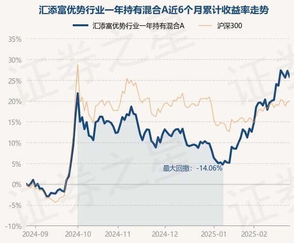 证券之星消息,2月27日,汇添富优势行业一年持有混合A最新单位净值为0.5624元,累计净值为0.5624元,较前一交易日下跌1.14%。历史数据显示该基金近1个月上涨11.74%,近3个月上涨13.05%,近6个月上涨25.79%,近1年上涨25.9%。该基金近6个月的累计收益率走势如下图: