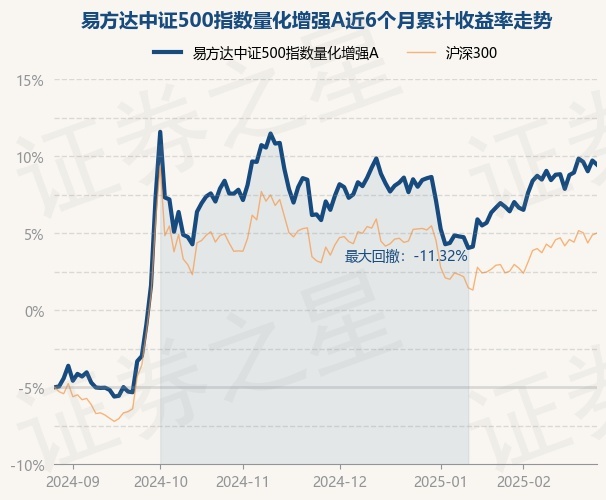 证券之星消息,2月27日,易方达中证500指数量化增强A最新单位净值为0.9416元,累计净值为0.9416元,较前一交易日下跌0.41%。历史数据显示该基金近1个月上涨4.53%,近3个月上涨3.85%,近6个月上涨28.92%,近1年上涨15.45%。该基金近6个月的累计收益率走势如下图:
