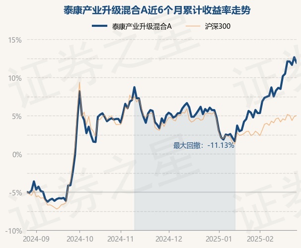 证券之星消息,2月27日,泰康产业升级混合A最新单位净值为1.847元,累计净值为2.0172元,较前一交易日下跌1.06%。历史数据显示该基金近1个月上涨10.95%,近3个月上涨12.23%,近6个月上涨33.89%,近1年上涨24.98%。该基金近6个月的累计收益率走势如下图: