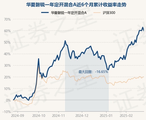 证券之星消息,2月27日,华夏磐锐一年定开混合A最新单位净值为1.3995元,累计净值为1.3995元,较前一交易日下跌1.79%。历史数据显示该基金近1个月上涨18.47%,近3个月上涨16.03%,近6个月上涨59.94%,近1年上涨39.73%。该基金近6个月的累计收益率走势如下图: