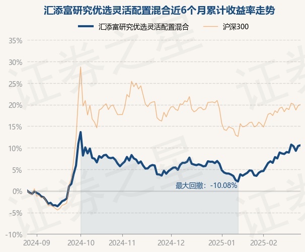 证券之星消息,2月27日,汇添富研究优选灵活配置混合最新单位净值为0.9525元,累计净值为1.2025元,较前一交易日上涨0.15%。历史数据显示该基金近1个月上涨5.77%,近3个月上涨5.62%,近6个月上涨10.58%,近1年上涨11.74%。该基金近6个月的累计收益率走势如下图: