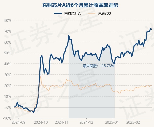 证券之星消息,2月27日,东财芯片A最新单位净值为0.9827元,累计净值为0.9827元,较前一交易日下跌0.32%。历史数据显示该基金近1个月上涨17.07%,近3个月上涨16.6%,近6个月上涨71.62%,近1年上涨55.69%。该基金近6个月的累计收益率走势如下图: