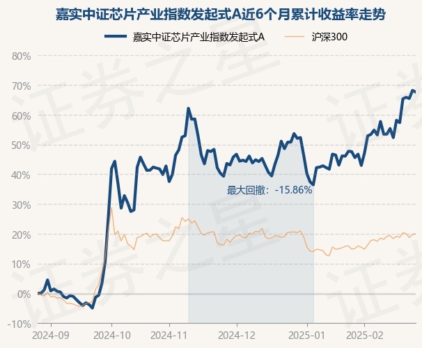 证券之星消息,2月27日,嘉实中证芯片产业指数发起式A最新单位净值为1.0525元,累计净值为1.0525元,较前一交易日下跌0.33%。历史数据显示该基金近1个月上涨17.24%,近3个月上涨16.7%,近6个月上涨67.62%,近1年上涨51.11%。该基金近6个月的累计收益率走势如下图: