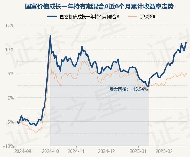 证券之星消息,2月27日,国富价值成长一年持有期混合A最新单位净值为0.934元,累计净值为1.0794元,较前一交易日上涨0.06%。历史数据显示该基金近1个月上涨10.93%,近3个月上涨8.23%,近6个月上涨32.63%,近1年上涨22.56%。该基金近6个月的累计收益率走势如下图: