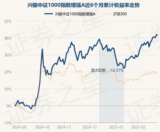 证券之星消息,2月27日,兴银中证1000指数增强A最新单位净值为0.9479元,累计净值为0.9479元,较前一交易日下跌0.25%。历史数据显示该基金近1个月上涨10.03%,近3个月上涨8.68%,近6个月上涨41.58%,近1年上涨22.42%。该基金近6个月的累计收益率走势如下图: