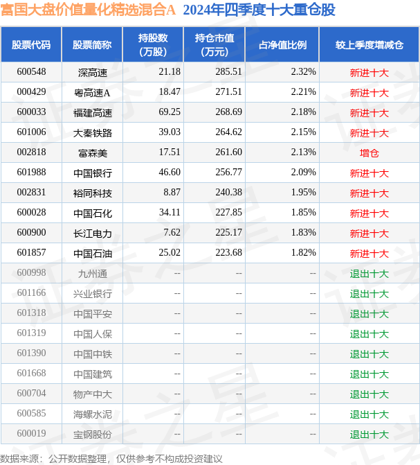 富国大盘价值量化精选混合A为混合型-偏股基金,根据最新一期基金季报显示,该基金资产配置:股票占净值比94.12%,债券占净值比1.48%,现金占净值比4.65%。基金十大重仓股如下: