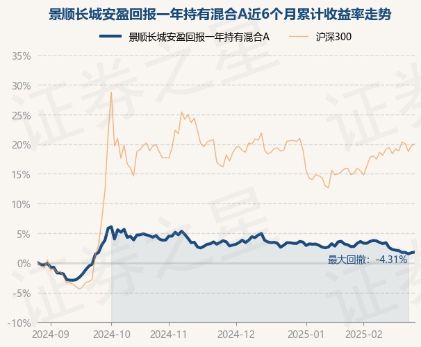 证券之星消息,2月27日,景顺长城安盈回报一年持有混合A最新单位净值为1.2079元,累计净值为1.2079元,较前一交易日上涨0.09%。历史数据显示该基金近1个月下跌1.73%,近3个月下跌1.68%,近6个月上涨1.8%,近1年上涨8.87%。该基金近6个月的累计收益率走势如下图:
