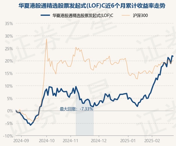 证券之星消息,2月27日,华夏港股通精选股票发起式(LOF)C最新单位净值为1.0691元,累计净值为1.0691元,较前一交易日下跌0.15%。历史数据显示该基金近1个月上涨13.56%,近3个月上涨18.02%,近6个月上涨21.72%,近1年上涨35.84%。该基金近6个月的累计收益率走势如下图: