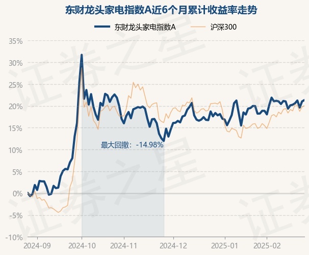 证券之星消息,2月27日,东财龙头家电指数A最新单位净值为1.0562元,累计净值为1.0562元,较前一交易日上涨0.26%。历史数据显示该基金近1个月上涨2.08%,近3个月上涨5.7%,近6个月上涨21.33%,近1年上涨20.97%。该基金近6个月的累计收益率走势如下图: