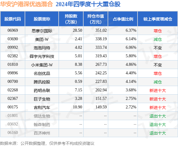华安沪港深优选混合为混合型-偏股基金,根据最新一期基金季报显示,该基金资产配置:股票占净值比93.68%,无债券类资产,现金占净值比6.93%。基金十大重仓股如下: