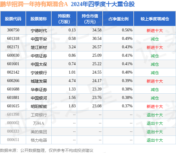 鹏华招润一年持有期混合A为混合型-偏债基金,根据最新一期基金季报显示,该基金资产配置:股票占净值比17.67%,债券占净值比91.09%,现金占净值比5.0%。基金十大重仓股如下: