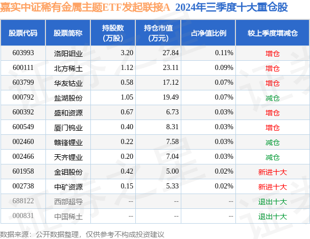 嘉实中证稀有金属主题ETF发起联接A为指数型-股票基金,根据最新一期基金季报显示,该基金资产配置:无股票类资产,无债券类资产,现金占净值比6.0%。基金十大重仓股如下: