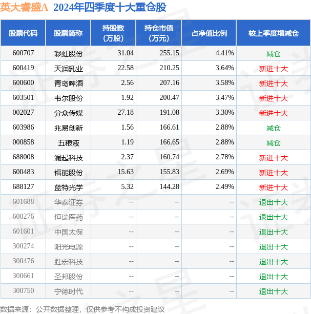 英大睿盛A为混合型-灵活基金,根据最新一期基金季报显示,该基金资产配置:股票占净值比85.72%,无债券类资产,现金占净值比14.91%。基金十大重仓股如下: