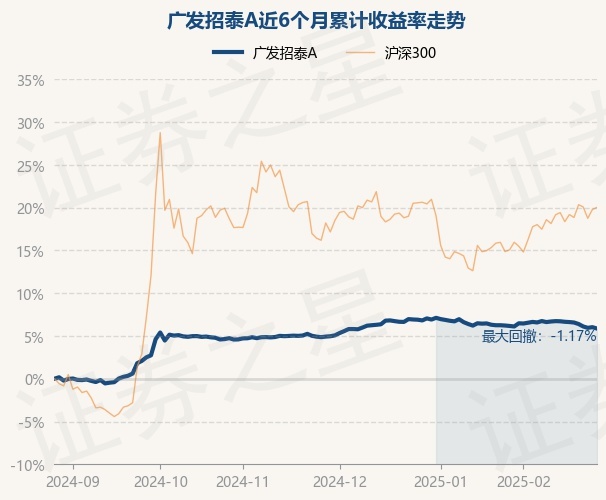 证券之星消息,2月27日,广发招泰A最新单位净值为1.2598元,累计净值为1.2598元,较前一交易日下跌0.15%。历史数据显示该基金近1个月下跌0.58%,近3个月上涨0.9%,近6个月上涨5.87%,近1年上涨8.68%。该基金近6个月的累计收益率走势如下图: