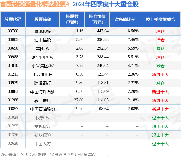 富国港股通量化精选股票A为股票型基金,根据最新一期基金季报显示,该基金资产配置:股票占净值比90.23%,无债券类资产,现金占净值比9.75%。基金十大重仓股如下: