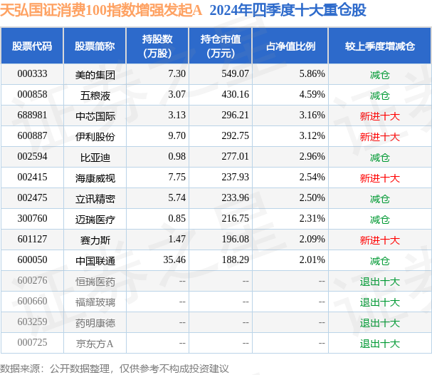 天弘国证消费100指数增强发起A为指数型-股票基金,根据最新一期基金季报显示,该基金资产配置:股票占净值比94.75%,债券占净值比0.65%,现金占净值比4.97%。基金十大重仓股如下: