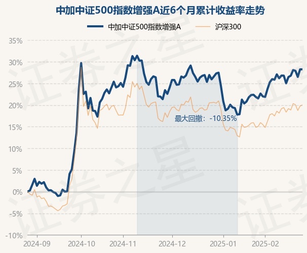 证券之星消息,2月27日,中加中证500指数增强A最新单位净值为0.9771元,累计净值为0.9771元,较前一交易日上涨0.0%。历史数据显示该基金近1个月上涨4.81%,近3个月上涨3.58%,近6个月上涨27.86%,近1年上涨12.57%。该基金近6个月的累计收益率走势如下图: