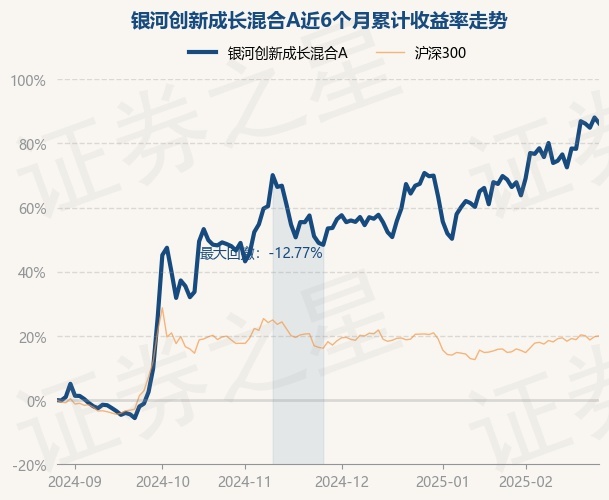 证券之星消息,2月27日,银河创新成长混合A最新单位净值为7.1453元,累计净值为7.1453元,较前一交易日下跌0.94%。历史数据显示该基金近1个月上涨13.73%,近3个月上涨21.37%,近6个月上涨86.31%,近1年上涨73.25%。该基金近6个月的累计收益率走势如下图: