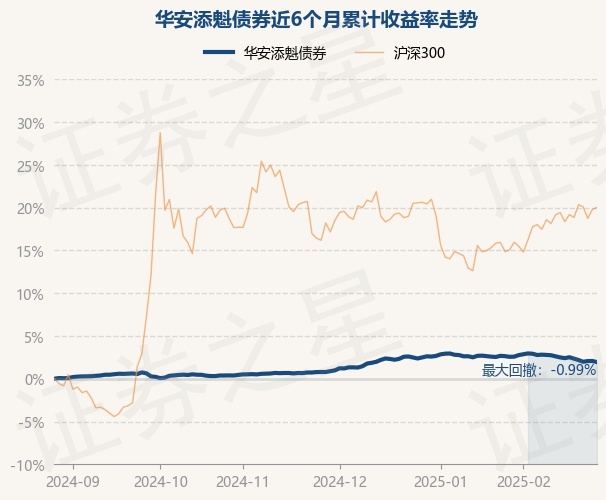 证券之星消息,2月27日,华安添魁债券最新单位净值为1.0512元,累计净值为1.0916元,较前一交易日下跌0.13%。历史数据显示该基金近1个月下跌0.8%,近3个月上涨1.15%,近6个月上涨1.94%,近1年上涨4.1%。该基金近6个月的累计收益率走势如下图: