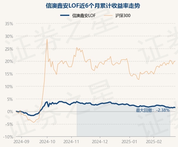 证券之星消息,2月27日,信澳鑫安LOF最新单位净值为0.996元,累计净值为1.374元,较前一交易日下跌0.1%。历史数据显示该基金近1个月下跌0.5%,近3个月上涨3.82%,近6个月上涨1.5%,近1年下跌0.24%。该基金近6个月的累计收益率走势如下图: