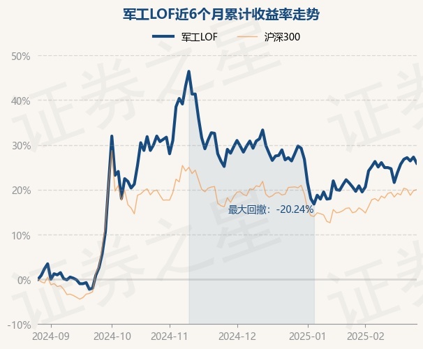 证券之星消息,2月27日,军工LOF最新单位净值为1.02元,累计净值为1.721元,较前一交易日下跌1.07%。历史数据显示该基金近1个月上涨5.37%,近3个月下跌2.39%,近6个月上涨25.93%,近1年上涨16.17%。该基金近6个月的累计收益率走势如下图: