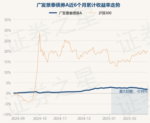 证券之星消息,2月27日,广发景泰债券A最新单位净值为1.0727元,累计净值为1.0727元,较前一交易日下跌0.12%。历史数据显示该基金近1个月下跌0.75%,近3个月上涨0.98%,近6个月上涨1.79%,近1年上涨4.06%。该基金近6个月的累计收益率走势如下图: