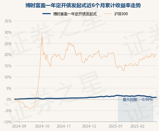 证券之星消息,2月27日,博时富盈一年定开债发起式最新单位净值为1.0483元,累计净值为1.0497元,较前一交易日下跌0.1%。历史数据显示该基金近1个月下跌0.76%,近3个月上涨0.14%,近6个月上涨0.77%,近1年上涨2.48%。该基金近6个月的累计收益率走势如下图: