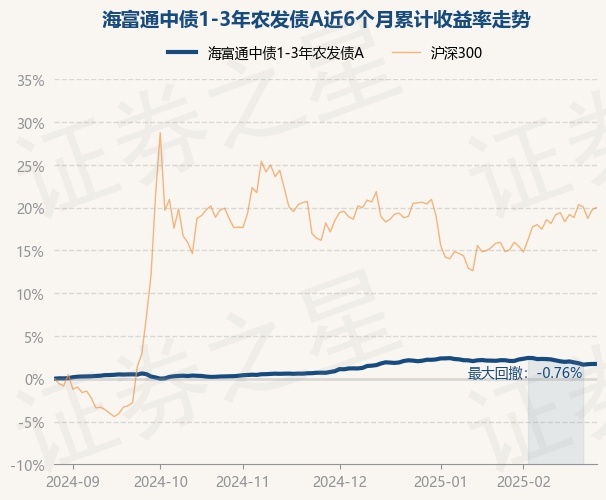 证券之星消息,2月27日,海富通中债1-3年农发债A最新单位净值为1.0669元,累计净值为1.1309元,较前一交易日上涨0.0%。历史数据显示该基金近1个月下跌0.61%,近3个月上涨0.93%,近6个月上涨1.63%,近1年上涨3.8%。该基金近6个月的累计收益率走势如下图: