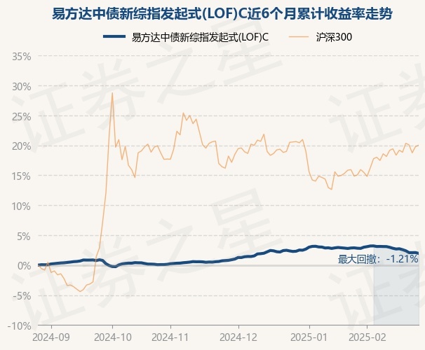 证券之星消息,2月27日,易方达中债新综指发起式(LOF)C最新单位净值为1.6761元,累计净值为1.6761元,较前一交易日下跌0.14%。历史数据显示该基金近1个月下跌1.0%,近3个月上涨1.15%,近6个月上涨1.96%,近1年上涨4.48%。该基金近6个月的累计收益率走势如下图: