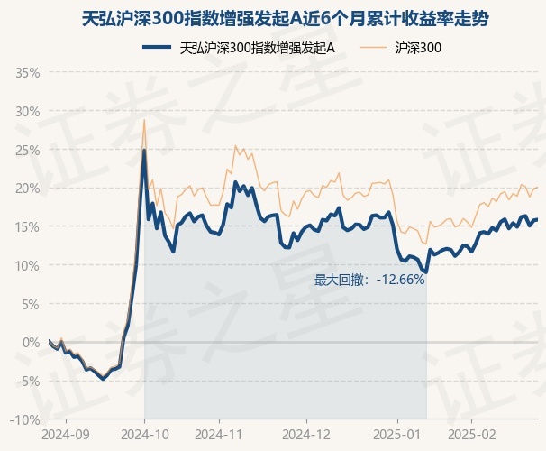 证券之星消息,2月27日,天弘沪深300指数增强发起A最新单位净值为1.2413元,累计净值为1.2413元,较前一交易日上涨0.09%。历史数据显示该基金近1个月上涨3.11%,近3个月上涨1.54%,近6个月上涨15.81%,近1年上涨12.46%。该基金近6个月的累计收益率走势如下图: