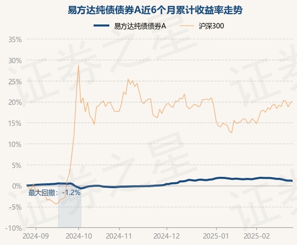证券之星消息,2月27日,易方达纯债债券A最新单位净值为1.1081元,累计净值为1.5971元,较前一交易日下跌0.06%。历史数据显示该基金近1个月下跌0.5%,近3个月上涨1.1%,近6个月上涨1.13%,近1年上涨3.18%。该基金近6个月的累计收益率走势如下图: