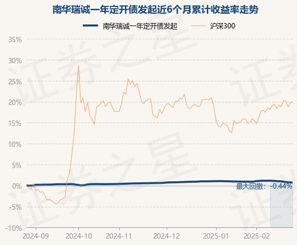 证券之星消息,2月27日,南华瑞诚一年定开债发起最新单位净值为1.0486元,累计净值为1.0924元,较前一交易日下跌0.05%。历史数据显示该基金近1个月下跌0.25%,近3个月上涨0.11%,近6个月上涨0.72%,近1年上涨2.11%。该基金近6个月的累计收益率走势如下图: