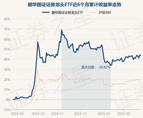 证券之星消息,2月27日,鹏华国证证券龙头ETF最新单位净值为1.2043元,累计净值为1.2043元,较前一交易日下跌0.28%。历史数据显示该基金近1个月上涨4.36%,近3个月下跌4.53%,近6个月上涨43.68%,近1年上涨25.68%。该基金近6个月的累计收益率走势如下图: