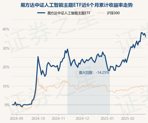 证券之星消息,2月27日,易方达中证人工智能主题ETF最新单位净值为1.0685元,累计净值为1.0685元,较前一交易日下跌2.01%。历史数据显示该基金近1个月上涨18.66%,近3个月上涨19.24%,近6个月上涨71.7%,近1年上涨43.52%。该基金近6个月的累计收益率走势如下图:
