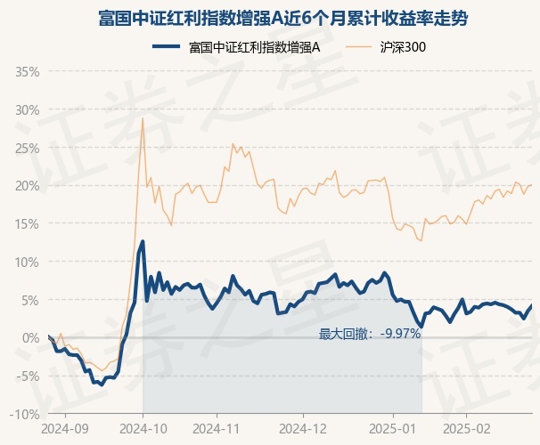 证券之星消息,2月27日,富国中证红利指数增强A最新单位净值为0.945元,累计净值为3.176元,较前一交易日上涨0.64%。历史数据显示该基金近1个月下跌0.84%,近3个月下跌0.25%,近6个月上涨4.07%,近1年上涨1.05%。该基金近6个月的累计收益率走势如下图: