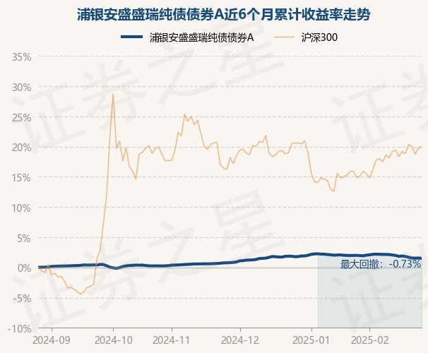 证券之星消息,2月27日,浦银安盛盛瑞纯债债券A最新单位净值为1.0564元,累计净值为1.1054元,较前一交易日下跌0.05%。历史数据显示该基金近1个月下跌0.51%,近3个月上涨0.71%,近6个月上涨1.5%,近1年上涨3.33%。该基金近6个月的累计收益率走势如下图: