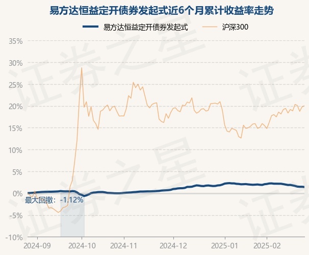 证券之星消息,2月27日,易方达恒益定开债券发起式最新单位净值为1.0214元,累计净值为1.3014元,较前一交易日下跌0.06%。历史数据显示该基金近1个月下跌0.63%,近3个月上涨0.74%,近6个月上涨1.4%,近1年上涨3.47%。该基金近6个月的累计收益率走势如下图: