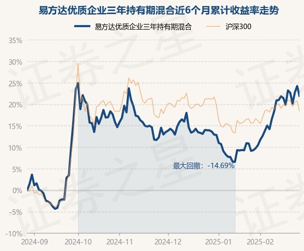 证券之星消息,2月28日,易方达优质企业三年持有期混合最新单位净值为0.9364元,累计净值为0.9364元,较前一交易日下跌1.86%。历史数据显示该基金近1个月上涨10.37%,近3个月上涨7.94%,近6个月上涨21.93%,近1年上涨15.91%。该基金近6个月的累计收益率走势如下图: