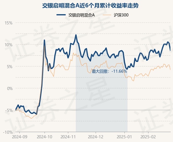 证券之星消息,2月28日,交银启明混合A最新单位净值为1.1581元,累计净值为1.3241元,较前一交易日下跌2.41%。历史数据显示该基金近1个月上涨3.74%,近3个月上涨2.28%,近6个月上涨27.35%,近1年上涨14.88%。该基金近6个月的累计收益率走势如下图: