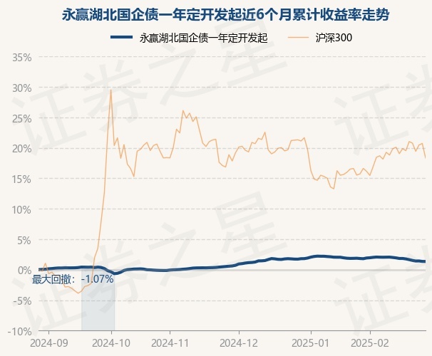 证券之星消息,2月28日,永赢湖北国企债一年定开发起最新单位净值为1.0637元,累计净值为1.079元,较前一交易日下跌0.01%。历史数据显示该基金近1个月下跌0.56%,近3个月上涨0.73%,近6个月上涨1.34%,近1年上涨3.32%。该基金近6个月的累计收益率走势如下图: