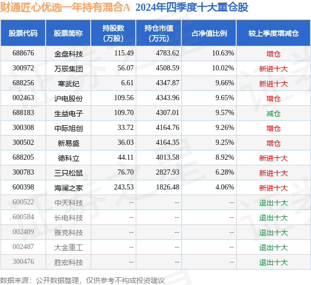 财通匠心优选一年持有混合A为混合型-偏股基金,根据最新一期基金季报显示,该基金资产配置:股票占净值比87.43%,无债券类资产,现金占净值比14.75%。基金十大重仓股如下: