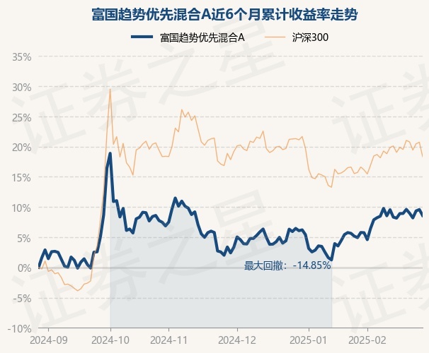 证券之星消息,2月28日,富国趋势优先混合A最新单位净值为0.7688元,累计净值为0.7688元,较前一交易日下跌0.9%。历史数据显示该基金近1个月上涨2.68%,近3个月上涨6.04%,近6个月上涨8.59%,近1年下跌1.56%。该基金近6个月的累计收益率走势如下图: