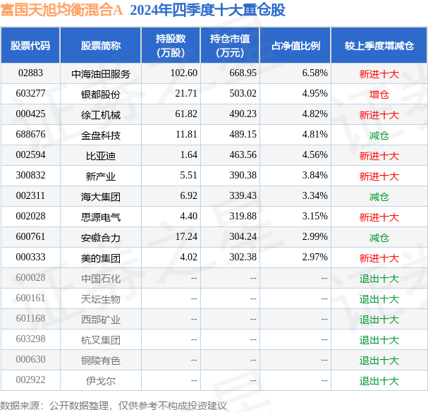 富国天旭均衡混合A为混合型-偏股基金,根据最新一期基金季报显示,该基金资产配置:股票占净值比85.02%,债券占净值比2.98%,现金占净值比11.84%。基金十大重仓股如下: