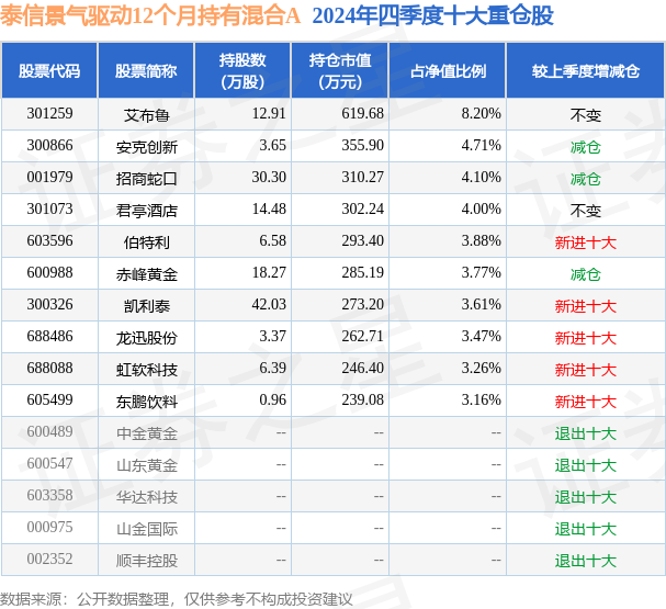泰信景气驱动12个月持有混合A为混合型-偏股基金,根据最新一期基金季报显示,该基金资产配置:股票占净值比74.23%,无债券类资产,现金占净值比26.09%。基金十大重仓股如下: