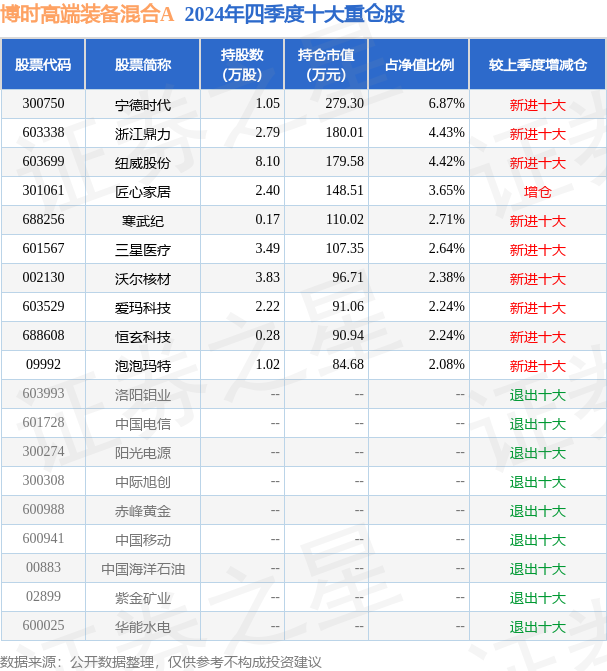博时高端装备混合A为混合型-偏股基金,根据最新一期基金季报显示,该基金资产配置:股票占净值比79.88%,债券占净值比2.05%,现金占净值比16.71%。基金十大重仓股如下: