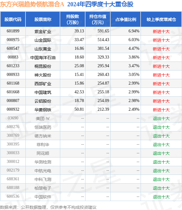 东方兴瑞趋势领航混合A为混合型-偏股基金,根据最新一期基金季报显示,该基金资产配置:股票占净值比72.2%,债券占净值比6.31%,现金占净值比34.28%。基金十大重仓股如下: